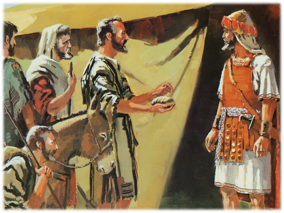 Sorgsam vermieden sie Jericho und Ai nicht zu erwähnen, denn das hätte sie verraten. Dann, als sie sahen, dass ihre Rede anfing auf Josua und die Fürsten von Israel einzuwirken, fuhren sie fort und zeigten ihnen die Nahrungsmittel, die sie mitgebracht hatten.