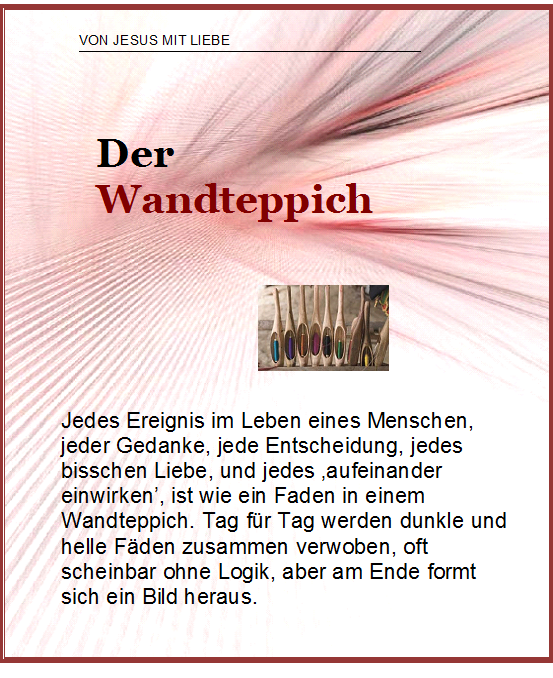 Die dunklen Fäden sind die Schwierigkeiten und Enttäuschungen, die Prüfungen und die Tränen. Auch diese sind notwendig, denn durch sie erscheinen die hellen Fäden noch strahlender und geben deinem Wandteppich seinen satten, warmen Schimmer.