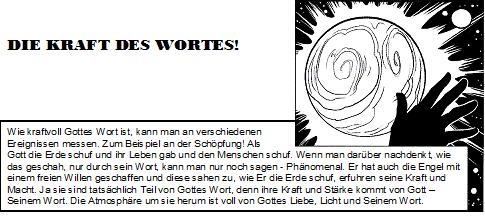 Wie kraftvoll Gottes Wort ist, kann man an verschiedenen Ereignissen messen. Zum Beispiel an der Schöpfung! Als Gott die Erde schuf und ihr Leben gab und den Menschen schuf. Wenn man darüber nachdenkt, wie das geschah, nur durch sein Wort, kann man nur noch sagen – Phänomenal. Er hat auch die Engel mit einem freien Willen geschaffen und diese sahen zu, wie Er die Erde schuf, erfuhren seine Kraft und Macht. Ja sie sind tatsächlich Teil von Gottes Wort, denn ihre Kraft und Stärke kommt von Gott – Seinem Wort. Die Atmosphäre um sie herum ist voll von Gottes Liebe, Licht und Seinem Wort.