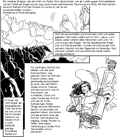 Ein weiteres Ereignis, das die Kraft von Gottes Wort demonstriert, war als Luzifer gegen Gott rebellierte und ein Drittel der Engel mit sich zog, durch seine verführerische Täuschung und Stolz. Mit Gott kehrten sie auch Seinem Wort den Rücken zu und es ist, als ob sie zurückerschaffen wurden – Schöpfung im Rückwärtsgang.