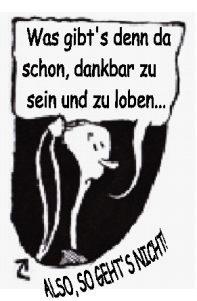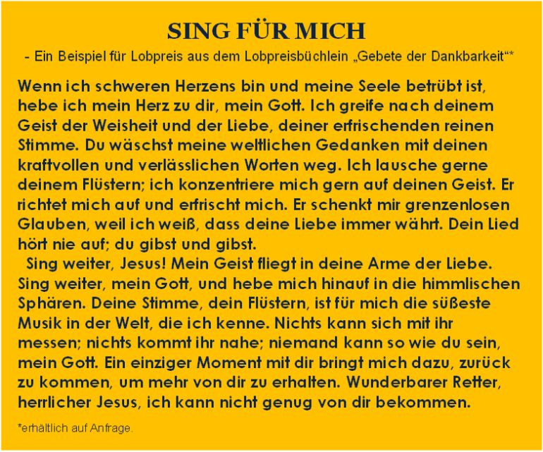 Lobe mich für jeden deiner Kämpfe, Schwächen und selbst den Fehlern. Ich lasse das alles zu, um dich zum Loben und Preisen zu bringen; und sobald du anfängst mich zu lobpreisen, hast du den Sinn dieser Kämpfe erfüllt und auf diese Weise wirst du jegliche Siege erringen. Ist das nicht toll, klasse, spitze, großartig oder wie immer du es nennen möchtest?