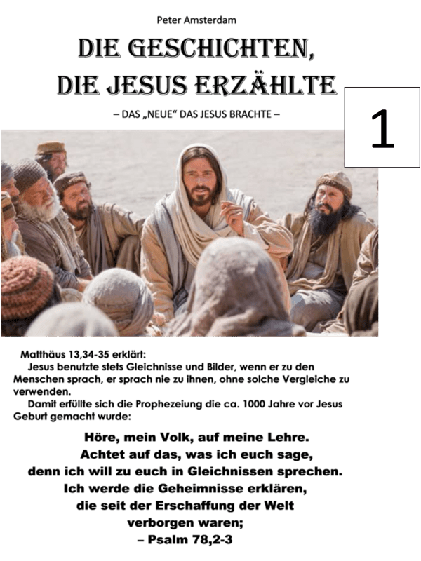 Als Antwort auf diese Frage habe ich diese Broschüre mit Studien der Gleichnisse Jesus von Peter Amsterdam zusammengestellt, um all jenen Jesus vorzustellen, die ihn nicht oder nicht sehr gut kennen und um ihnen eine Chance zu geben, ihn und was er lehrte kennenzulernen.