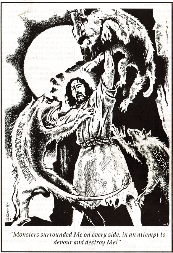 umgeben von Monster, die ihn verschlingen und vernichten wollten. Monster von Zweifel, Verzweiflung und Entmutigung!