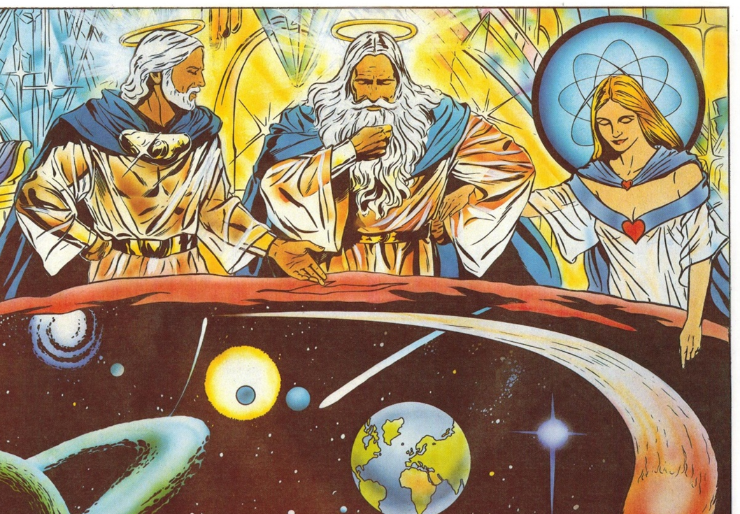 Gott ist Geist, d.h. er ist Macht und Kraft, und erfüllt das gesamte All, einer Sphäre, wo es weder Raum noch Zeit gibt, nur die Unendlichkeit Gottes. (Für unser menschliches Verständnis ist Gott hier als ein Vater dargestellt und die Kraft des Heiligen Geistes als eine Mutter – die Familie Gott! Sie haben kein Alter, sind immer.)